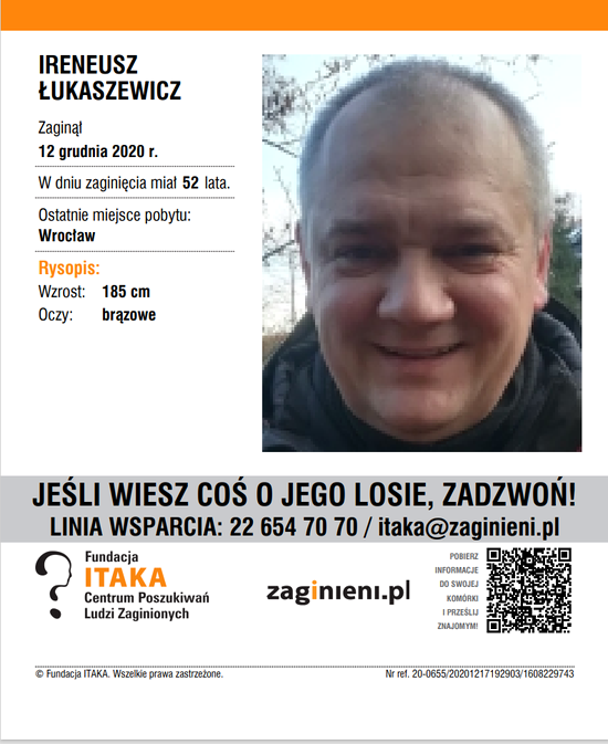 Komunikat dotyczący osoby zaginionej poszukiwanej przez Fundację ITAKA: 12 grudnia 2020 r. we Wrocławiu (woj. dolnośląskie) zaginął Ireneusz Łukaszewicz. Ma 185 cm wzrostu i brązowe oczy. W dniu zaginięcia miał 52 lata. Ubiór w dniu zaginięcia: szaro-czarna kurtka z pomarańczowymi wstawkami, ciemne spodnie. Może potrzebować pilnej pomocy!Ktokolwiek widział zaginionego lub ma jakiekolwiek informacje o jego losie, proszony jest o kontakt z Fundacją ITAKA - Centrum Poszukiwań Ludzi Zaginionych, pod numerem 22 654 70 70. Można również napisać w tej sprawie do ITAKI: