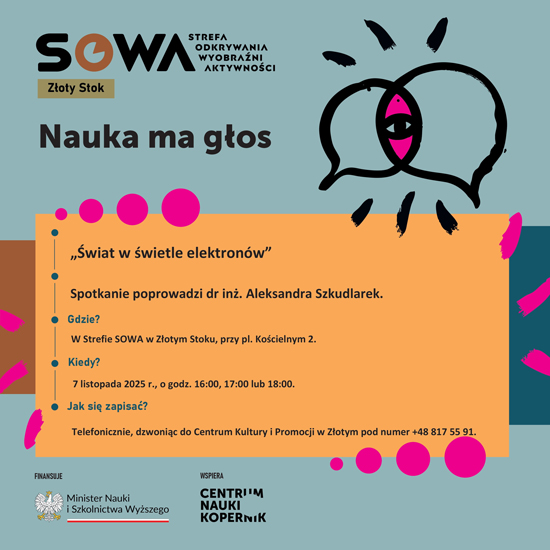Strefa Odkrywania, Wyobraźni i Aktywności (SOWA) w Złotym Stoku po raz kolejny staje się przestrzenią łączącą świat nauki z lokalną społecznością. Tym razem mieszkańcy regionu będą mieli okazję uczestniczyć w pasjonującym wykładzie pt. „Świat w świetle elektronów. Co lasery mówią o narodzinach zjawisk?”. Spotkanie poprowadzi dr inż. Aleksandra Szkudlarek - badaczka nanomateriałów i procesów fizykochemicznych, związana z Akademickim Centrum Materiałów i Nanotechnologii AGH oraz European XFEL w Hamburgu. Uczestnicy dowiedzą się m.in., jak działają lasery na swobodnych elektronach, jak naukowcy rejestrują ulotne procesy fizyczne i dlaczego światło odgrywa kluczową rolę w badaniu przyrody. Zapisy na wydarzenie prowadzone są telefonicznie pod numerem +48 817 55 91.