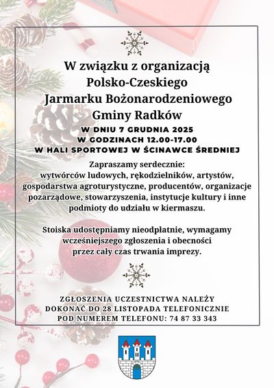 Centrum Kultury i Biblioteka już rozpoczęło przygotowania do jarmarku bożonarodzeniowego. Do 1 grudnia br. przyjmuje zgłoszenia od przedsiębiorców zainteresowanych udziałem w tym wydarzeniu: