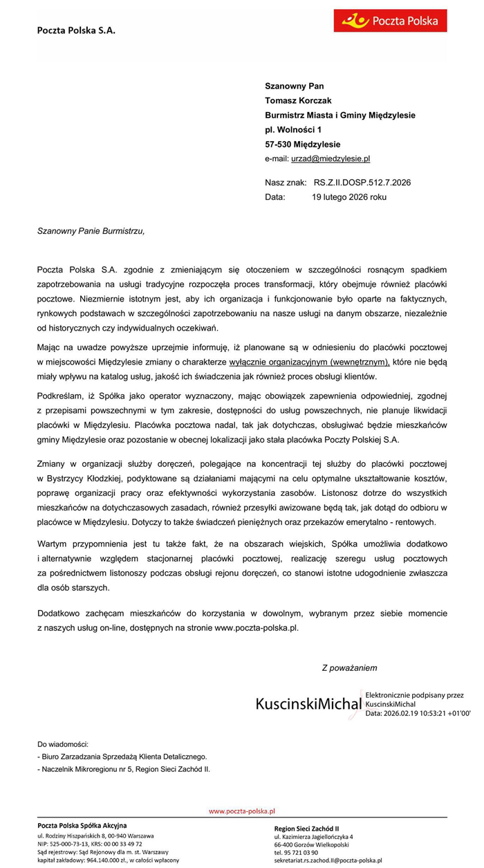 (Inf. zewn.). W związku z pojawiającymi się informacjami o planowanych zmianach w organizacji doręczeń w Międzylesiu, burmistrz Tomasz Korczak wystąpił do Poczty Polskiej o oficjalne stanowisko w tej sprawie. Z przekazanej odpowiedzi wynika, że lokalna placówka nie zostanie zlikwidowana, a mieszkańcy nadal będą korzystać z usług na dotychczasowych zasadach.