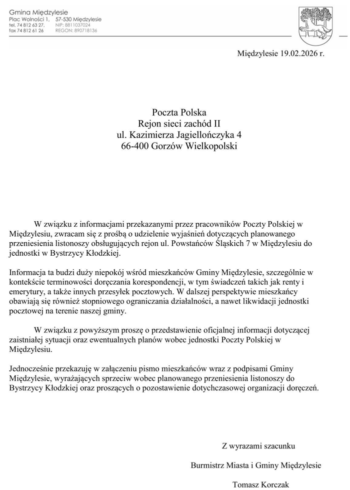 W odpowiedzi na te obawy burmistrz Tomasz Korczak skierował do Poczty Polskiej oficjalne pismo z prośbą o wyjaśnienie planowanych działań oraz przedstawienie ewentualnych planów wobec placówki funkcjonującej w Międzylesiu.