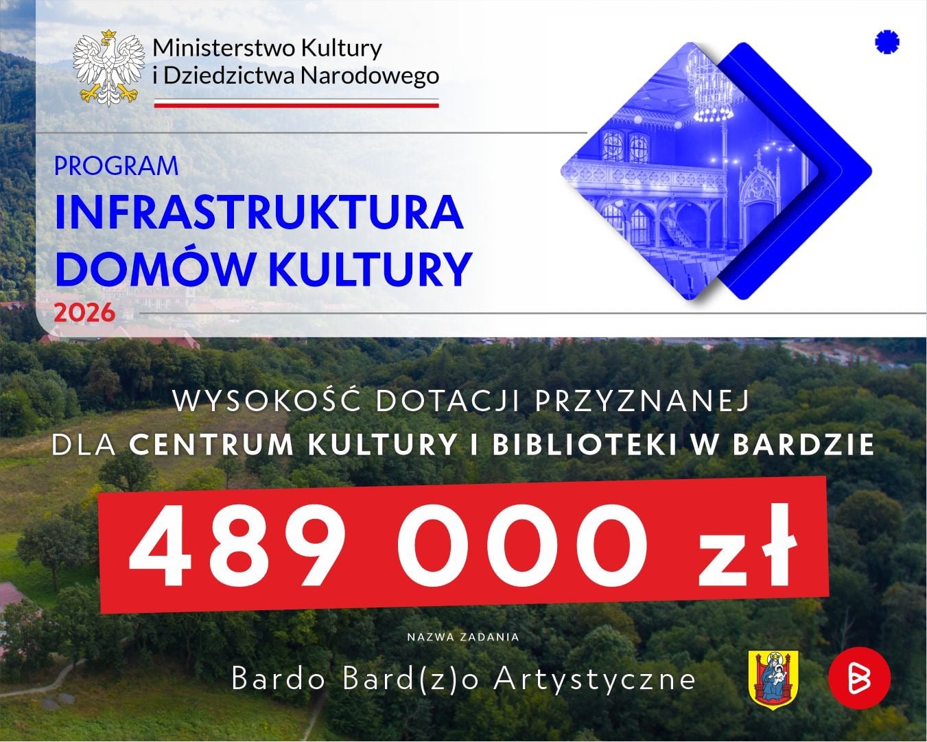 (Inf. wł.). Centrum Kultury i Biblioteka w Bardzie otrzymało 489 tys. zł dofinansowania w ramach programu „Infrastruktura Domów Kultury”. Środki pozwolą na zakup nowoczesnego wyposażenia do odbudowywanej sali widowiskowej przy ul. Kolejowej 12.