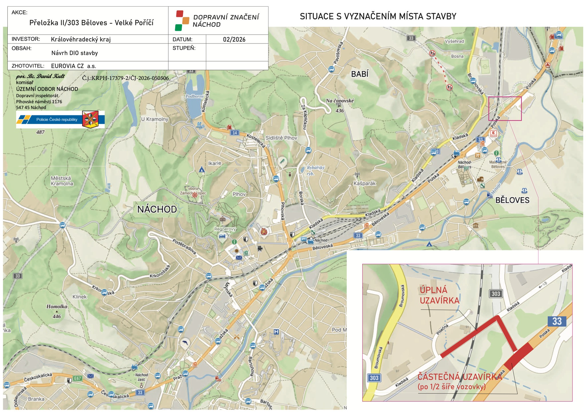 Władze miasta Náchod informują, że utrudnienia są związane z budową obwodnicy oraz przełożeniem drogi II/303 na odcinku Běloves – Velké Poříčí. Zmiany obejmą skrzyżowanie drogi I/33 z ul. Polská, w pobliżu hipermarketu Albert i przejścia granicznego Náchod – Kudowa-Zdrój. W miejscu obecnego skrzyżowania powstanie rondo.