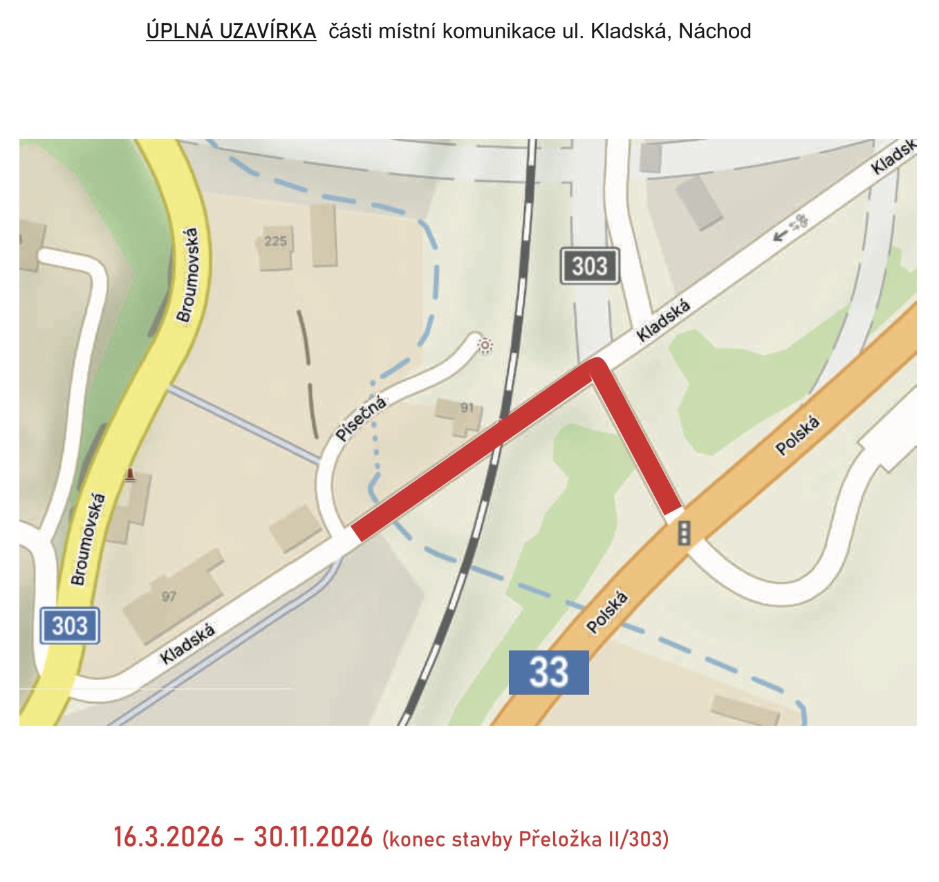Władze miasta Náchod informują, że utrudnienia są związane z budową obwodnicy oraz przełożeniem drogi II/303 na odcinku Běloves – Velké Poříčí. Zmiany obejmą skrzyżowanie drogi I/33 z ul. Polská, w pobliżu hipermarketu Albert i przejścia granicznego Náchod – Kudowa-Zdrój. W miejscu obecnego skrzyżowania powstanie rondo.