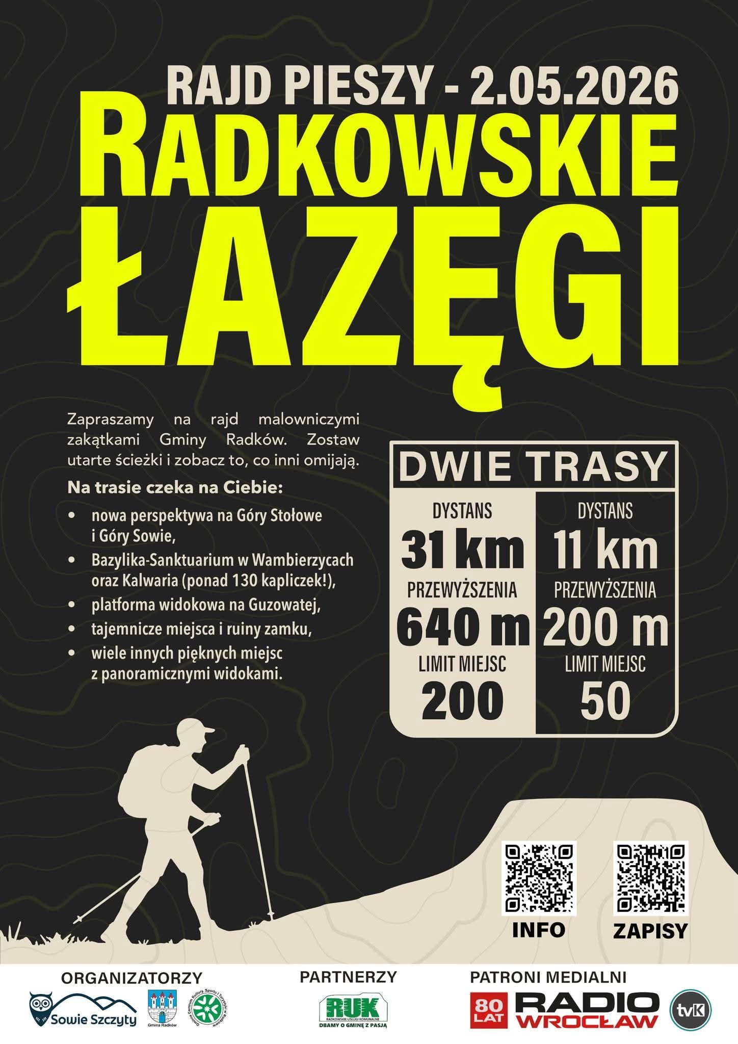 (Inf. wł.). Radkowskie Łazęgi to nowa propozycja dla miłośników pieszych wędrówek, która połączy aktywność sportową z rodzinną rekreacją i promocją walorów gminy Radków. Uczestnicy będą mogli wybrać jedną z dwóch tras, a na miejscu nie zabraknie także dodatkowych atrakcji dla dzieci i dorosłych.