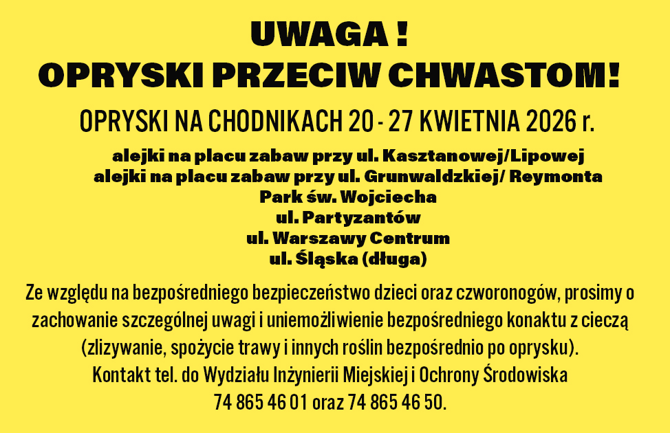 (Inf. zewn.). W dniach 20-27 kwietnia na terenie Kłodzka zaplanowano prace związane ze zwalczaniem niepożądanej roślinności. Mieszkańcy proszeni są o zachowanie szczególnej ostrożności, zwłaszcza podczas spacerów z dziećmi oraz zwierzętami domowymi.
