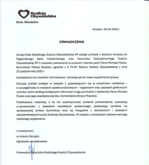 Tymczasem Koło Miejskie Koalicji Obywatelskiej, której M. Piszko jest członkiem, wydało 29 bm. oświadczenie w przedmiotowej sprawie: